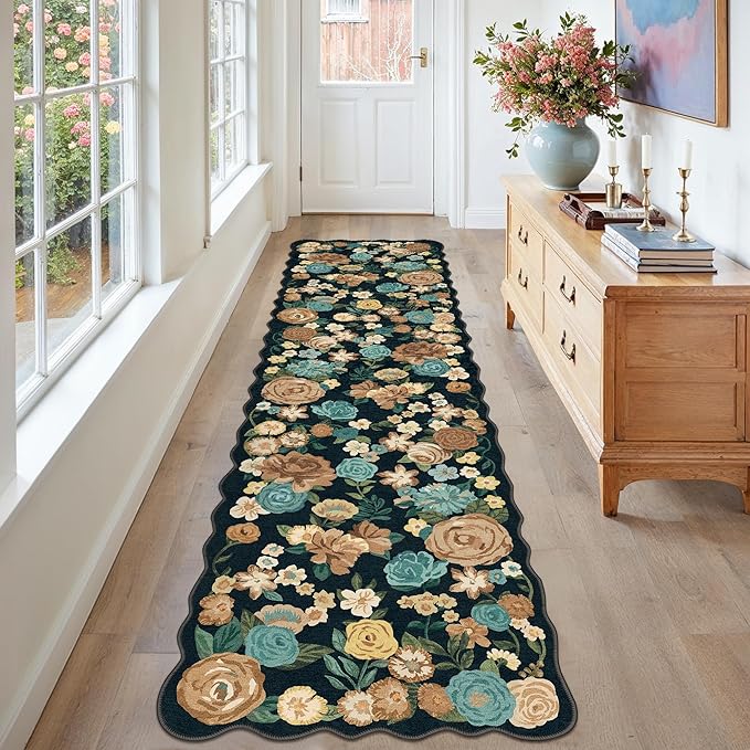 Washable Floral Runner Rug 2x8 Black Hallway Carpet Scalloped Flower Non Slip Soft Long Kitchen Runner Farmhouse Low Pile Thin Indoor Floor Cover for Bathroom Bedroom Laundry Room Entryway