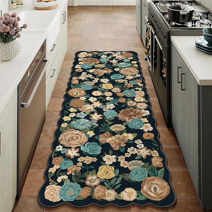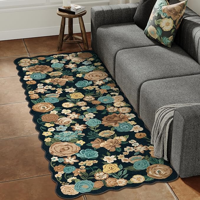 Washable Floral Runner Rug 2x5 Black Hallway Carpet Scalloped Flower Non Slip Soft Long Kitchen Runner Farmhouse Low Pile Thin Indoor Floor Cover for Bathroom Bedroom Laundry Room Entryway