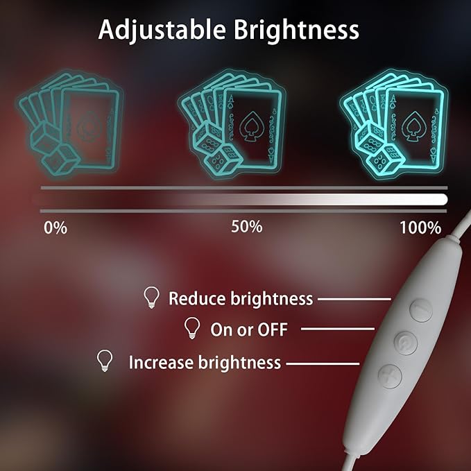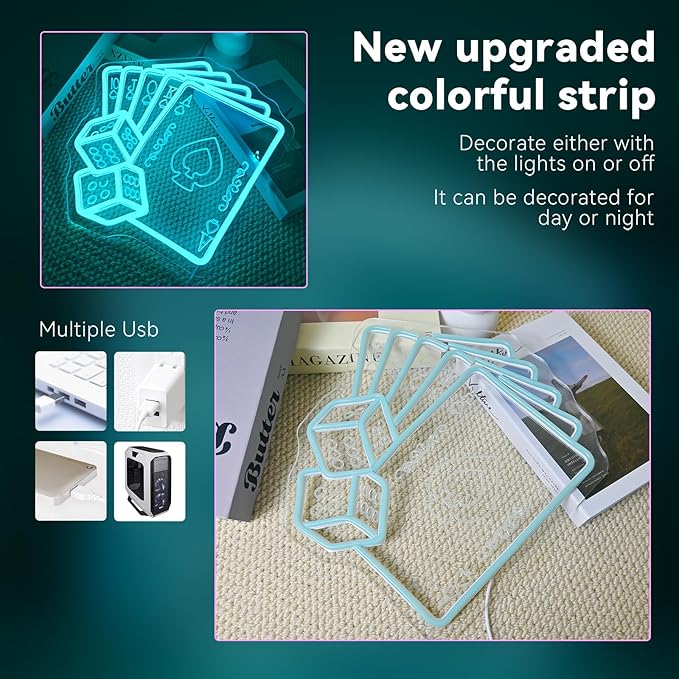 - High Quality Material:Blue Poker Neon Signs Comes with a 59.1-inch cable. Can be connected to power bank/charger, etc.The USB cable has on/off and dimmable, multi-gear adjustment buttons, which can be adapted to any environment. You can adjust it according to the amount of time you need to use it.The rated output is 5V2A. to ensure safety and energy saving