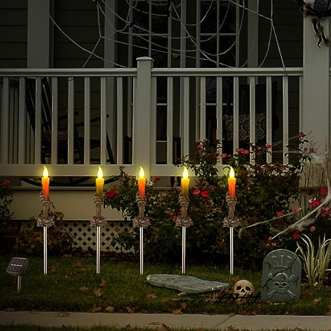 ILLUMINEW Halloween Decorations Outdoor, 5 Pack Solar Pathway Lights, LED Skull Hand Candle Holder, Outdoor Party Home Garden Porch Decor