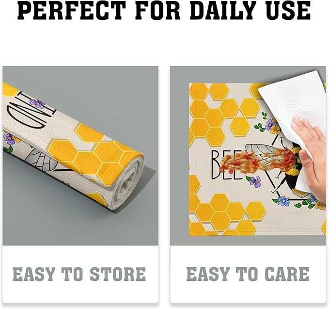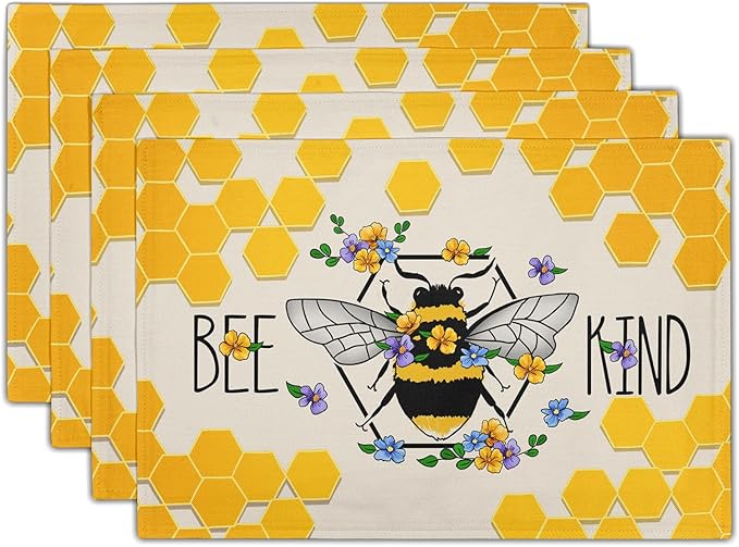 Giwawa Bee Kind Placemats Set of 4-12"x18" Summer Bees Floral Linen Place Mat- Yellow Honeycomb Washable Heat Resistant Table Mats for Kitchen Dining Party Tabletop Picnic Decoration