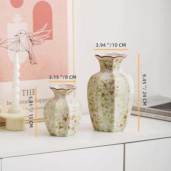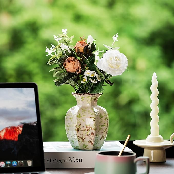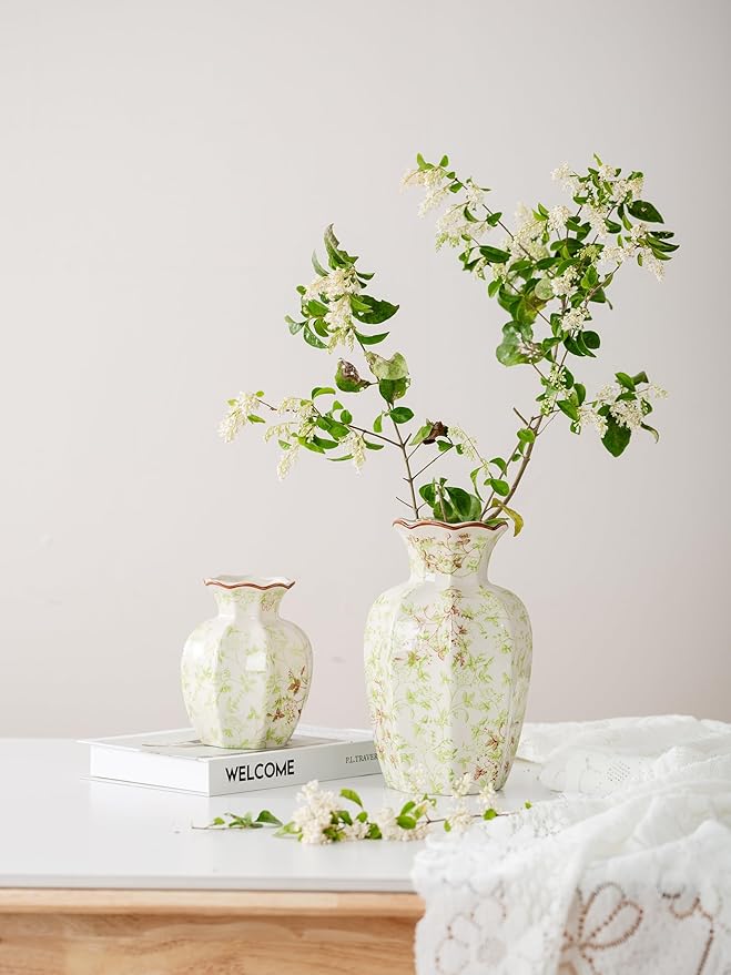 Blue and White Vase, Vintage Blue Ceramic Flower Vessel,Ceramic vases for Home Decor,Vintage Green and Beige for Console Table Mantle Chinoiserie Decor (Green and Beige-01, Small)
