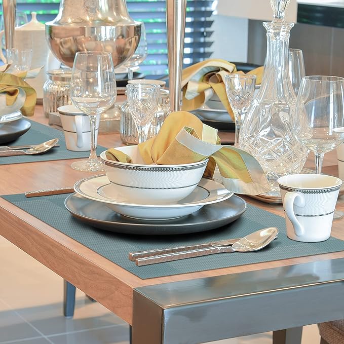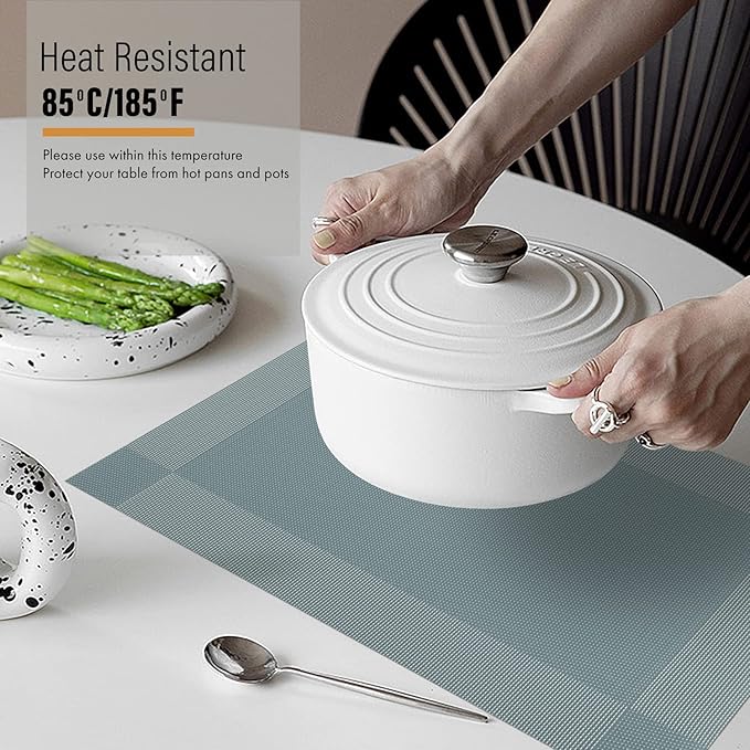- Material: Placemats woven with high quality eco-friendly PVC materials. Effective heat resistance of approximately 176°F (80°C), protecting your table from stains, scratches from tableware.