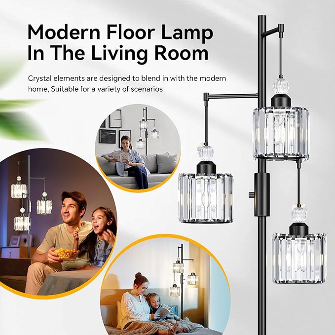 70" Black Tree Floor Lamp with 3 Crystal Cage Lampshades & Dimmable Bulbs - Vintage Glam Standing Lamp for Living Room Bedroom, Industrial Modern Decor with Crystal Ball Accents