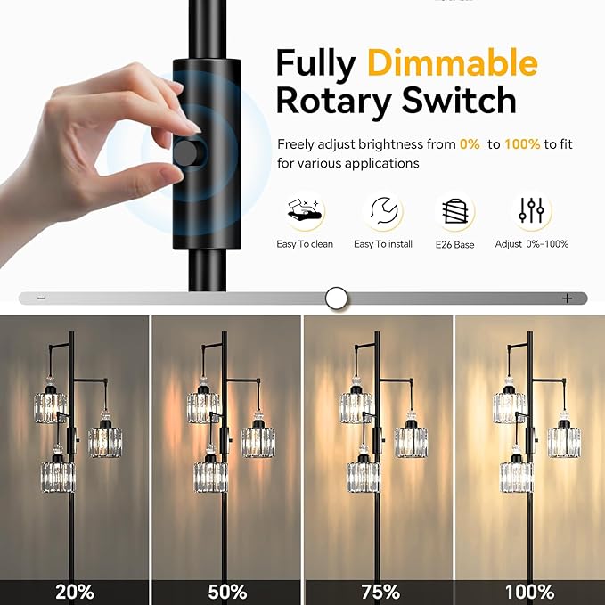 - Triple Brightness Theater Control: Smoothly cycle through ambient/reading/festive modes via the industrial-grade rotary dimmer (compatible with smart bulbs). Each of the 3 E26 sockets holds included 2700K dimmable bulbs, casting layered light pools for piano corners, fireplace seating, or vanity mirrors.