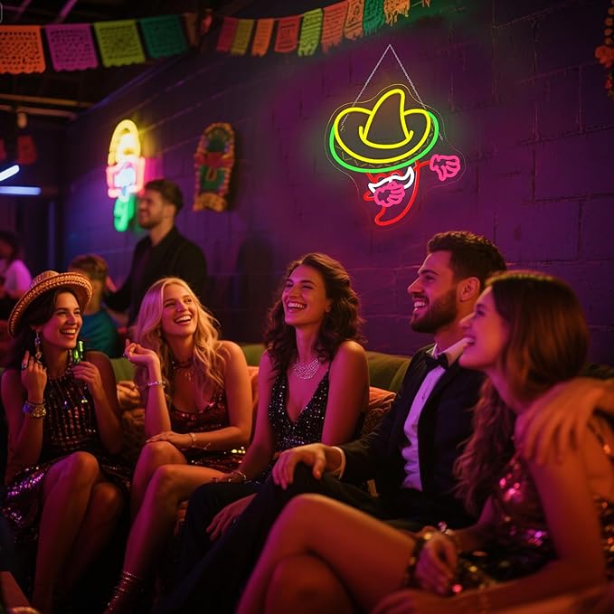 - Classy & Spicy Design: This unique neon sign combines elegant gentleman iconography with fiery chili pepper accents, featuring a warm red glow that creates a bold statement. Mexican fiesta neon light contain a strong Cinco De Mayo customs