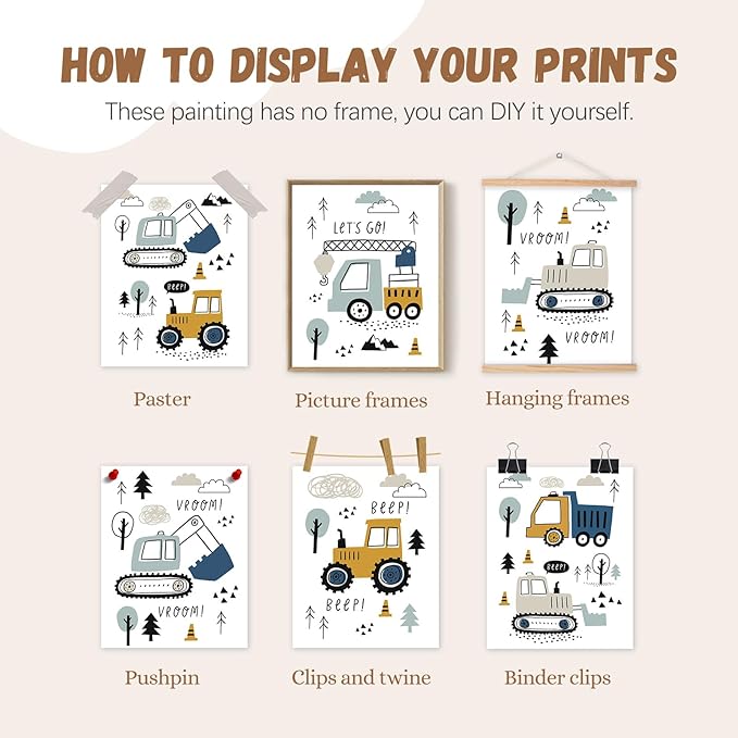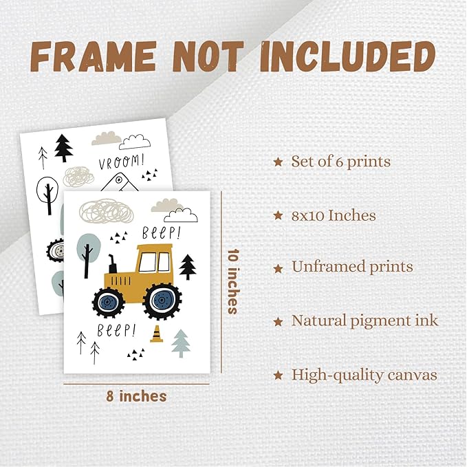 Canssape Set of 6 Baby Boy Nursery Wall Decor | 8"x10"Construction Room Decor for Boys | Truck Wall Art For Kids Room (Unframed)