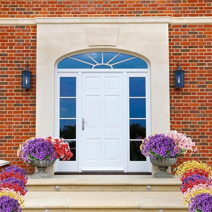 - 💐【Outdoor Artificial Plants】💐These aesthetically pleasing outdoor artificial plants are suitable for various areas of your home, including your porch, walkway, front yard, garden, living room, kitchen, bedroom, balcony, and more, adding a touch of natural beauty to your surroundings. Available in a variety of vibrant colors, these silk flowers require no watering and withstand harsh weather conditions without wilting.