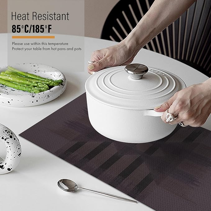 - Material: Placemats woven with high quality eco-friendly PVC materials. Effective heat resistance of approximately 176°F (80°C), protecting your table from stains, scratches from tableware.