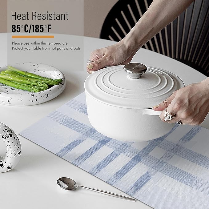 - Material: Placemats woven with high quality eco-friendly PVC materials. Effective heat resistance of approximately 176°F (80°C), protecting your table from stains, scratches from tableware.