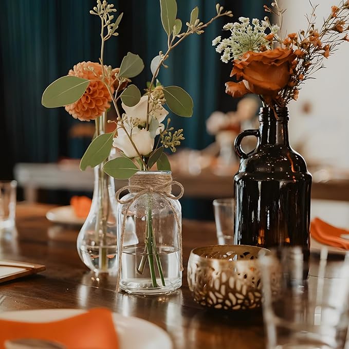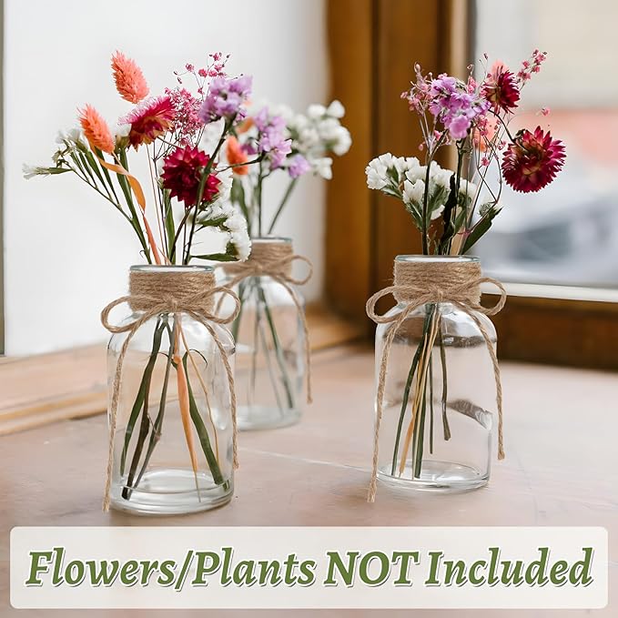 - Versatile Mini Vases for Table Centerpieces: Rustic vases with hemp rope bows are suitable for displaying both fresh flower cuttings and fake blooms. Clear glass design allows the colors and textures of flowers to shine in small vases to enhance any room