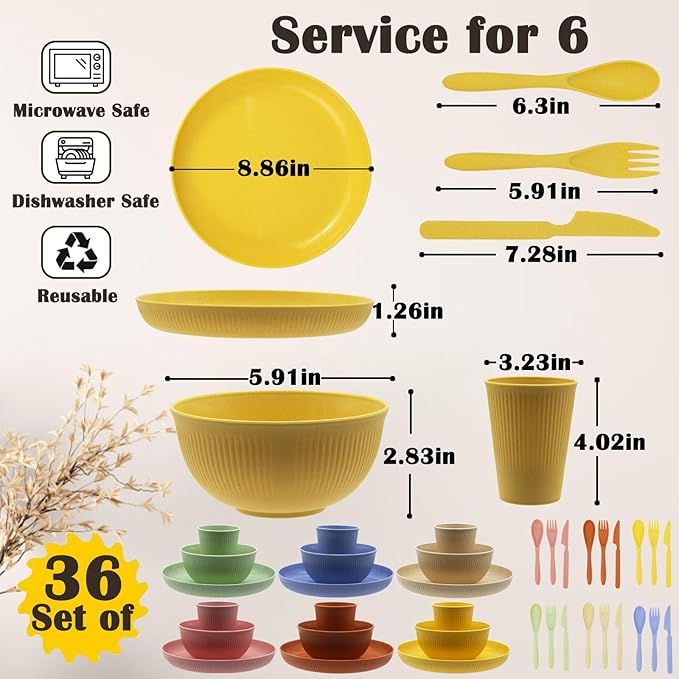 Wheat Straw Dinnerware Set, 36pcs Dishes Plates and Bowls Sets, Service for 6, Reusable Dinnerware Set Kitchen Cups Plates and Bowls Sets