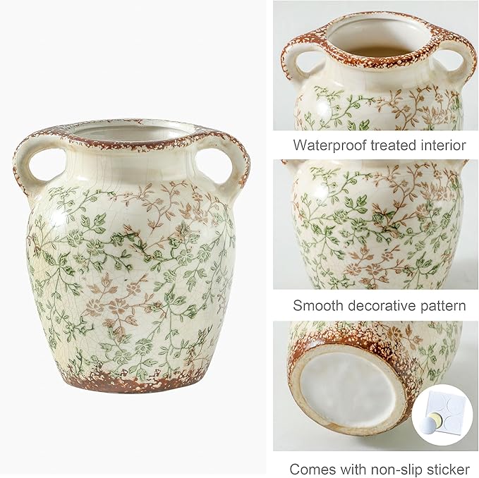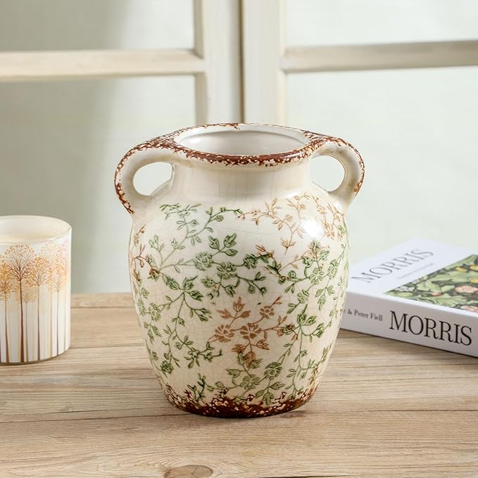 Enra Vintage vase,Green and Beige Ceramic Decorative Flower vase, Chinoiserie Floral Vase,Large Rustic Vases for Home Decors, Living Room, Bookshelf, Office 7.8 Inch