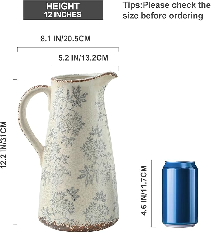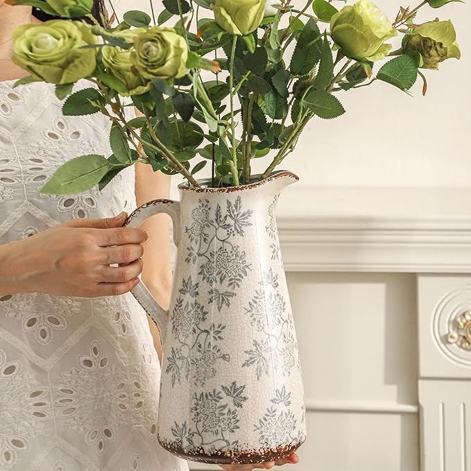 Enra Blue and White vase with Handle,12.2 inch Ceramic Vintage Decorative Flower Pitcher vase, Chinoiserie Floral Vase,Large Rustic Vases for Home Decors, Living Room, Bookshelf, Office