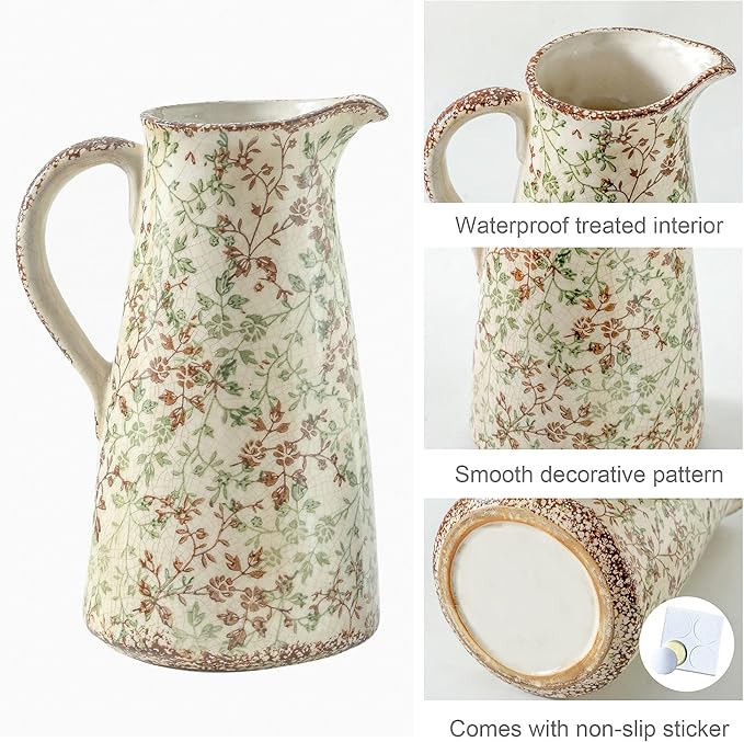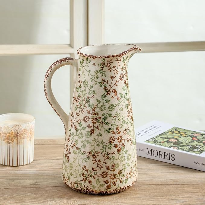 Enra Pitcher vase with Handle,12.2 in Ceramic Vintage Chinoiserie Floral Vase,Green and Beige Decorative Flower vase,Large Rustic Vases for Home Decors, Living Room, Bookshelf, Office