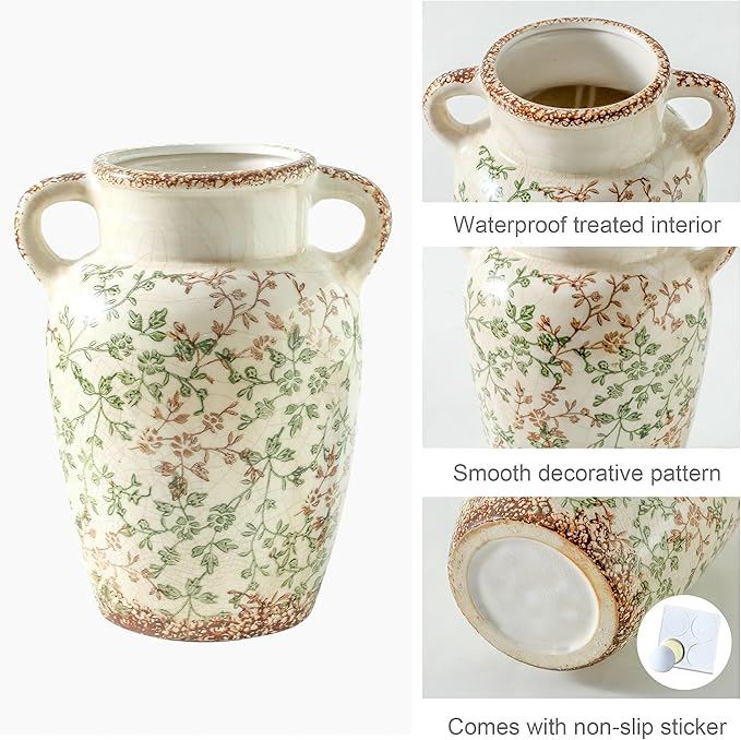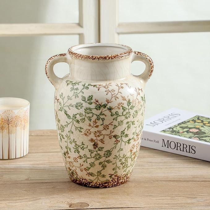 Enra Farmhouse Vintage vase with Handle,9.4 in Ceramic Chinoiserie Floral Vase,Green and Beige Decorative Flower vase,Large Rustic Vases for Home Decors, Living Room, Bookshelf, Office