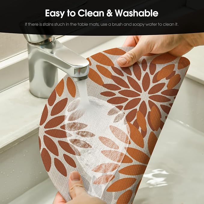 - Easy To Clean:The washable vinyl placemats simply wipe with soap,water and a soft sponge or cloth.Scrub stubborn stains with a soft bristle-brush and a bleach-based cleanse.