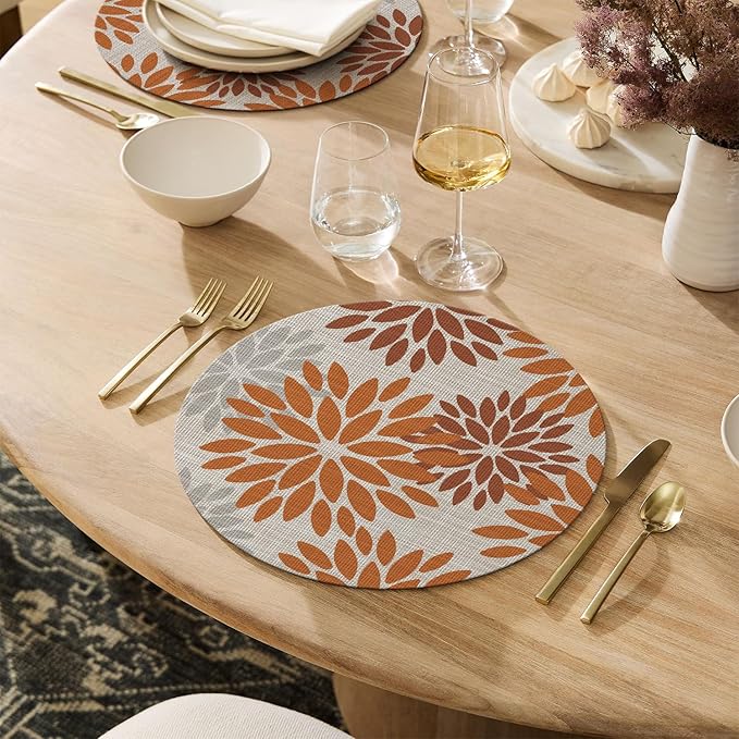Artoid Mode Orange Dahlia Plastic Round Placemats Set of 4, 14 Inch Seasonal Wipeable Woven Vinyl Table Mats for Farmhouse Party Kitchen Dining Decor