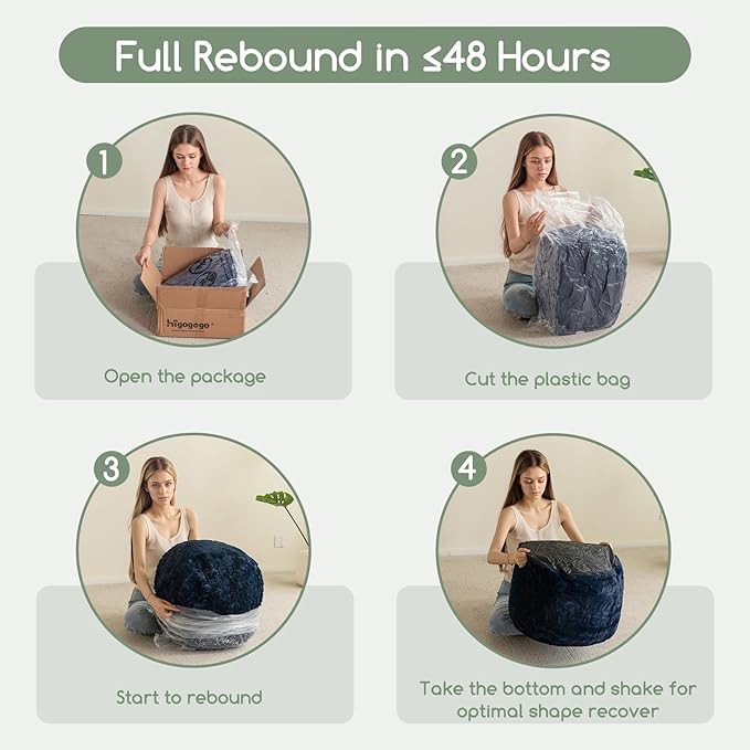 - No Assembly Required: There is no need to assemble.Vacuum packing, Just take out and wait for 48-72 hours, it will fully rebound to its full size.if still did not return to the full size,please just adjust the pouf cover and rub the foam filler and wait more time.Achieve optimal foam hardness within 7 days for enduring support.