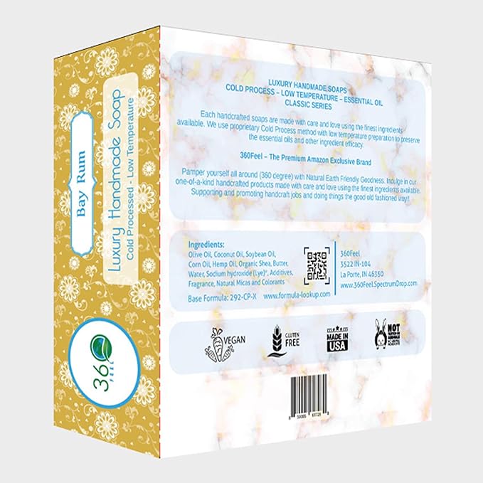 360Feel Bay Rum Soap - Handcrafted Castile Soap Bar with Spicy Scent - Handmade with Bay Rum Essential Oil for Men - A Gift for Anniversaries, Weddings, and Holiday Stockings - Rich Lather - 4 pack