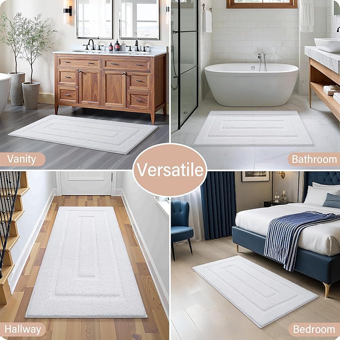 - tra Soft and Versatile: The white bathroom rug with high density microfiber provide a comfortable to your feet, 24x48 inch long runner suitable for bathroom kitchen bedroom laundry room use