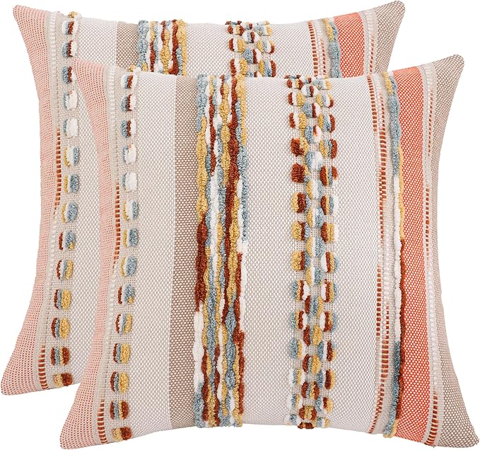 Tosleo Boho Throw Pillow Covers 18x18 Set of 2 Striped Decorative Pillow Cases Accent Chenille Pillowcases Farmhouse Cushion Case Bohemian Nuetral Textured Pillow Cover,Orange