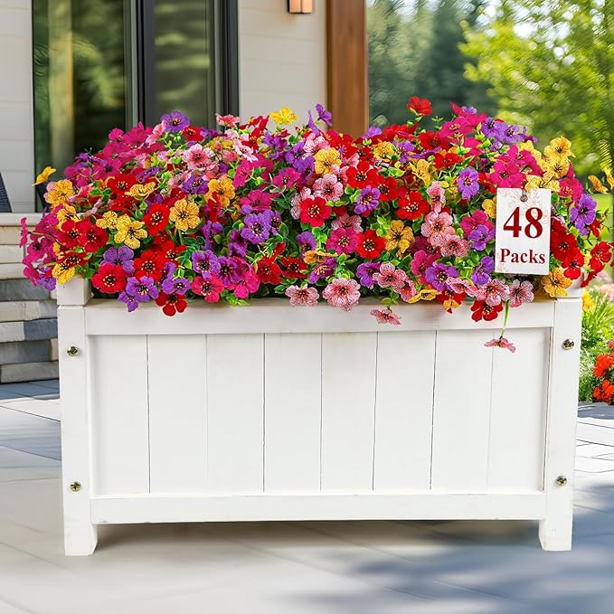 - 🌸【Perfect for Outdoor/Indoor】Plastic flowers are ideal for outdoor porches, walkway, terraces window box, front yard, pots ,hanging planters, gardens, landscape, windowsills, allow you have beautiful color all year around. Also suit for birthdays, weddings, memorial place or grave, they can live anywhere and have withstood heavy rain storms and winds.