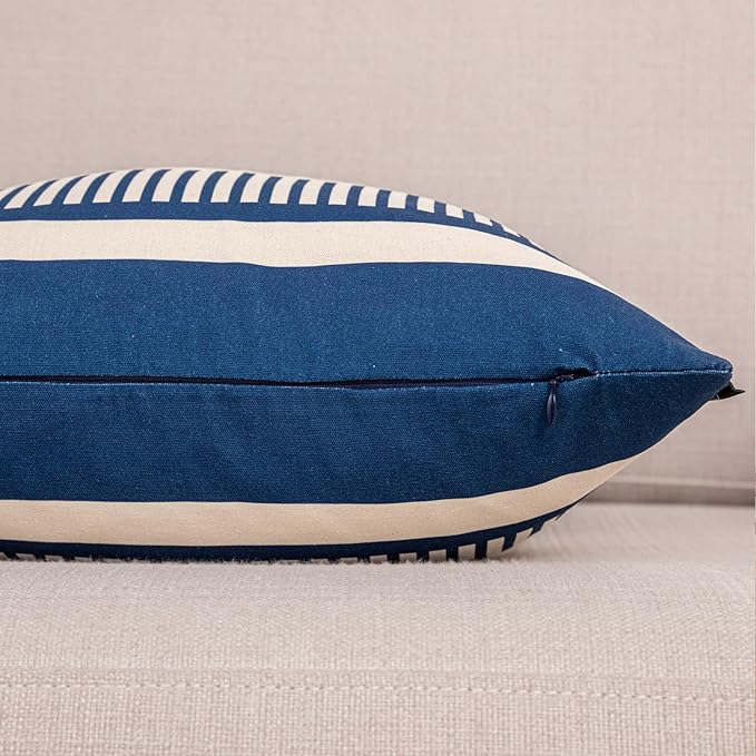 Farmhouse Stripe Pillow Cover 18x18 Boho Accent Cushion Case Faux Leather Decorative Pillowcase,Navy Blue and Beige (Cover ONLY, Pack of 1)