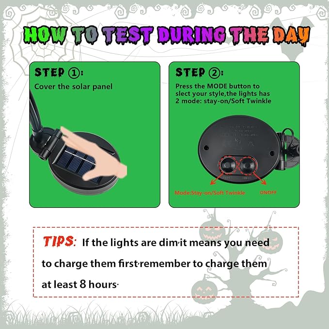 - Upgraded Two Lighting Modes: The outdoor solar lights have 2 lighting modes (Steady On and Soft Twinkling Mode) to meet your different outdoor decoration needs which can add a lot of vitality to your garden. The steady on mode can meet the needs of most people,the light will steady on one color as long as it has power. The soft twinkling mode can breathe like fireflies,adds more spunk and mischief to Halloween!