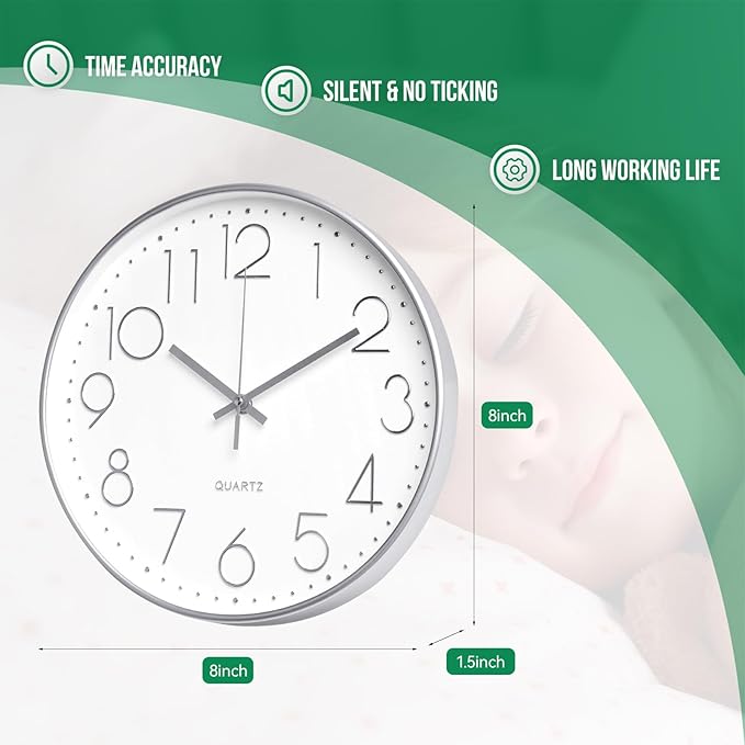 Wall Clock Non-Ticking Silent Modern Simple Style Round Decor Clock Stereoscopic Dial Quartz Wall Clocks for Home/Office/School/Living Room/Bedroom/Kitchen (Silver, 8inch)