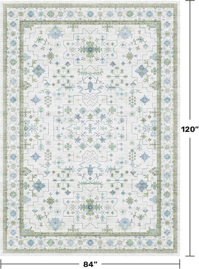 Blue and Green Living Room Rug 7x10 - Cream Oushak Vintage Boho Floral Farmhouse, Washable Low Pile Non-Slip Extra Large Area Rugs for Bedroom, Kids, Lounge