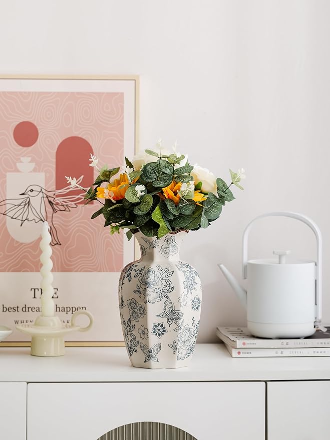 - 【ELEGANT DESIGN】This handcrafted Chinese-style vase features beautiful blue and white patterns and an elegant hexagonal outline, making it perfect for enhancing your home decor. As a blue and white vase, its floral patterns add a unique charm to any setting.
