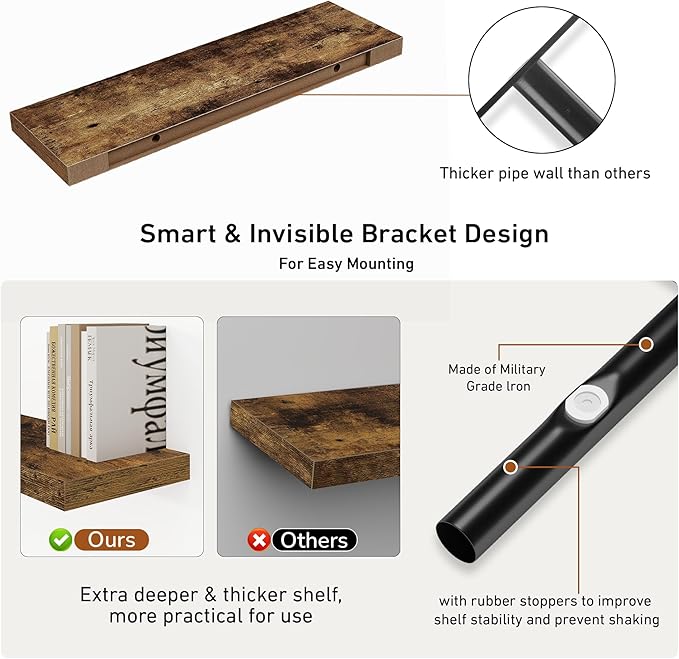 - Rustic & Modern Wooden Floating Shelves - Our shelf is made of durable engineered wood with a natural wood grain finish for a rustic feel. Matte surface makes it modern and minimalist look. It can be mounted and decorated on every wall of your home, perfect for various scenes, whether display your collection or storage.