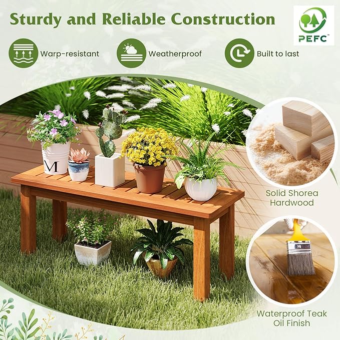 - Sturdy and Reliable Construction: This outdoor plant stand is crafted of solid Shorea wood, which is known for its durability and strength while less prone to cracking or warping. Moreover, it features PEFC certification, ensuring it comes from sustainably managed forests.