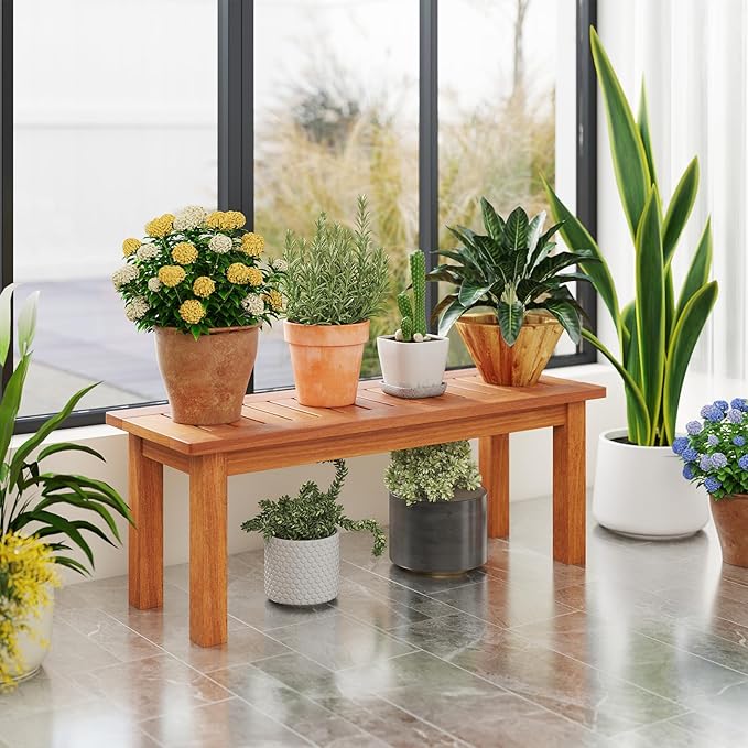 - Sufficient Displaying Space: The wooden plant shelf measures 34” x 12” x 13” (L x W x H) and offers a slatted top, promoting ventilation, preventing water accumulation. It is ideal for showing various potted plants, from lush flowers and succulents to cacti, bamboos, bonsai, orchids, or herbs.