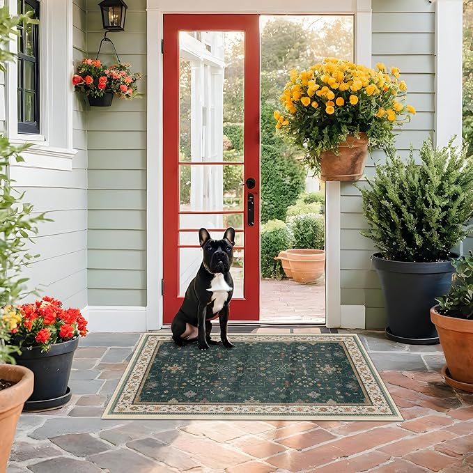 Dark Green Oushak 3x4 Large Entryway Rug - Modern Vintage Boho Floral, Washable Low Pile Non-Slip Area Rugs for Door Mat Indoor Entrance, Kitchen, Bedroom Beside Bed