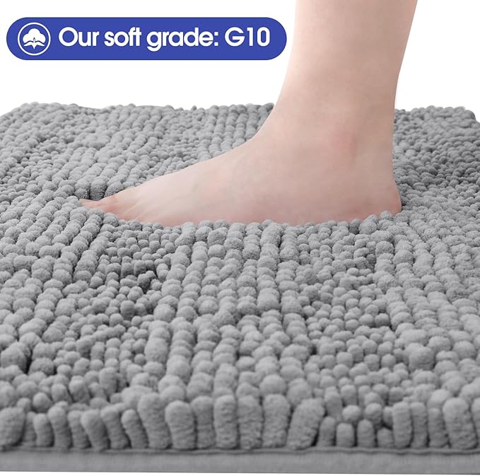- SUPERIOR ABSORBENCY: The bold pile chenille on the top surface of the luxurious toilet mat soak up a lot of water and keep your floor dry when you're stepping out of the bath, Bathtub, shower, or getting ready by the sink, moisture is trapped in the bathroom rug’s deep pile, to avoid the dripping water disturbing your bathroom's serenity and tidy.