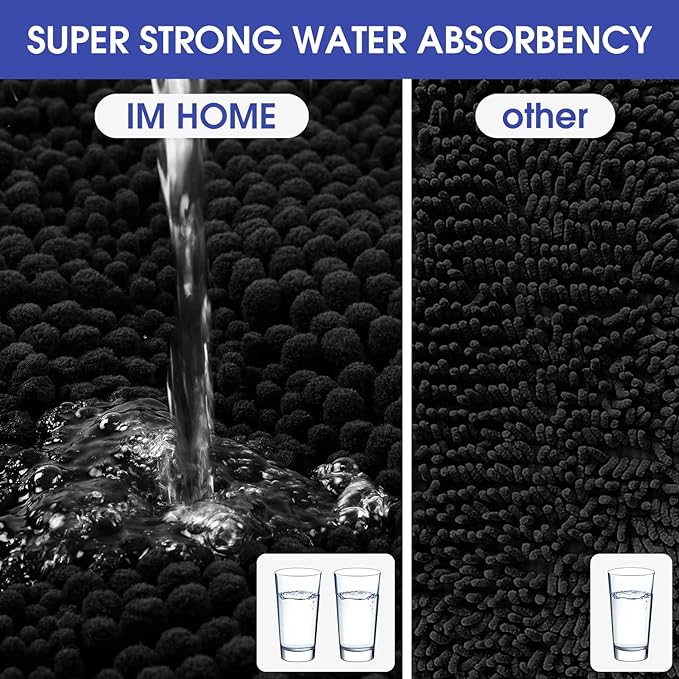 - SUPERIOR ABSORBENCY: The bold pile chenille on the top surface of the luxurious toilet mat soak up a lot of water and keep your floor dry when you're stepping out of the bath, Bathtub, shower, or getting ready by the sink, moisture is trapped in the bathroom rug’s deep pile, to avoid the dripping water disturbing your bathroom's serenity and tidy.
