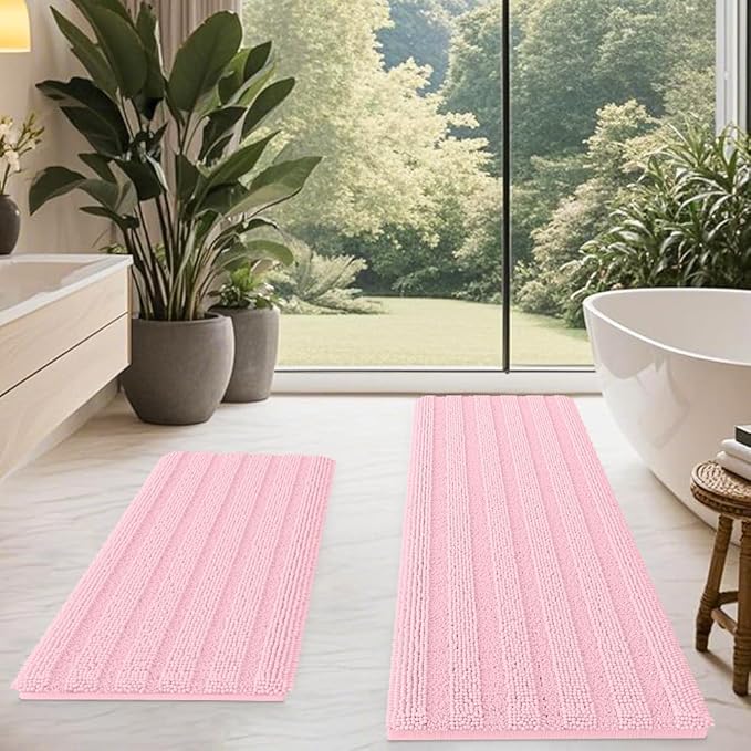 ACCUMTEK Striped Pink Bathroom Rug Mat Set 2 Piece 32"x20"+60"x20" Ultra Soft, Non Slip Chenille Bath Rugs, Absorbent Plush Shaggy Bath Mats for Bathroom, Bedroom, Kitchen, Shower, Tub