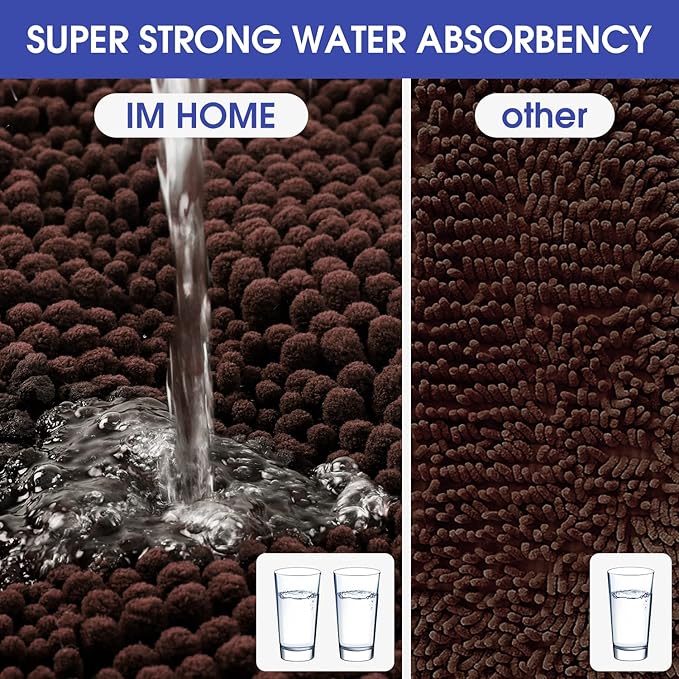 - SUPERIOR ABSORBENCY: The bold pile chenille on the top surface of the luxurious toilet mat soak up a lot of water and keep your floor dry when you're stepping out of the bath, Bathtub, shower, or getting ready by the sink, moisture is trapped in the bathroom rug’s deep pile, to avoid the dripping water disturbing your bathroom's serenity and tidy.