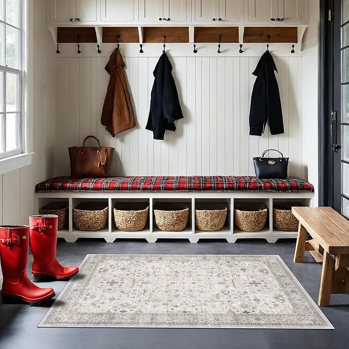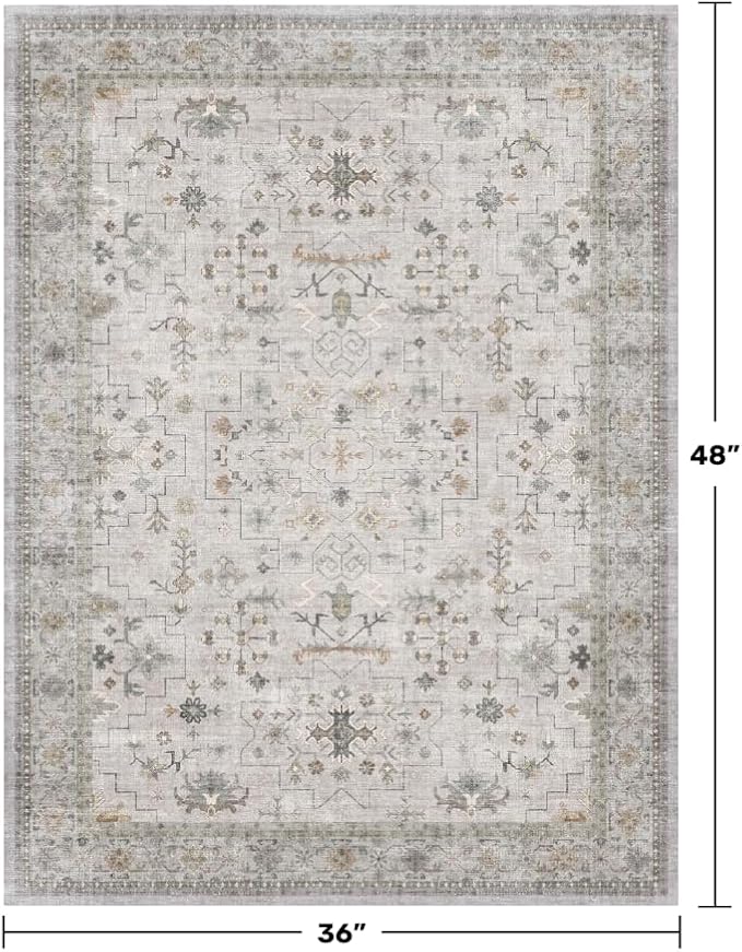 Light Grey 3x4 Large Boho Bathroom Rug - Modern Vintage Eclectic Floral Pastel Neutral Taupe, Washable Low Pile Non-Slip Area Rugs for Entryway, Kitchen, Bedroom Beside Bed, Powder Room