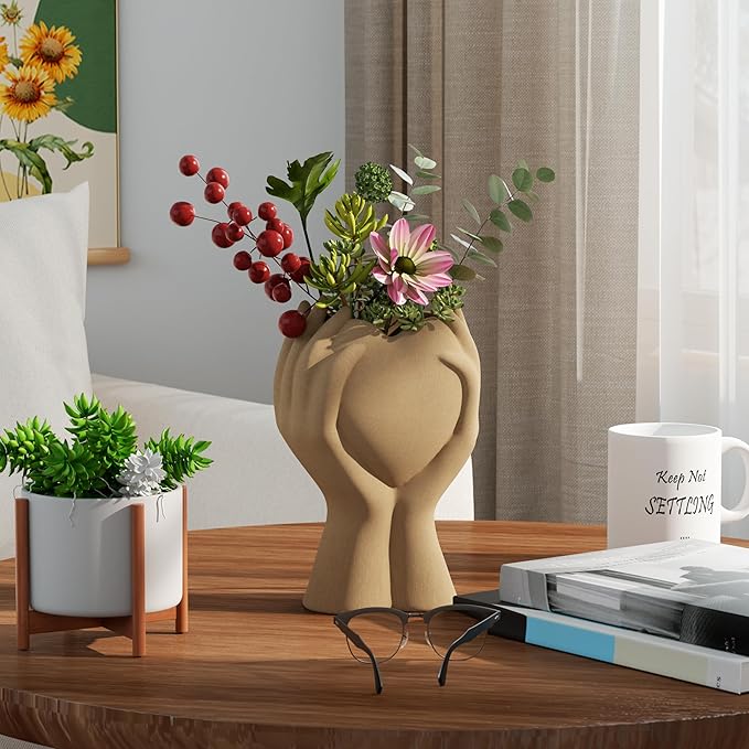 - 🌸 Unique Design & Symbolism: Crafted with a hand carrying a heart, the VUZDVGO Heart Hand Ceramic Vase is a perfect representation of love and care. Its thoughtful design makes it an ideal daughter's gift from mother or dad, symbolizing the deep bond between parents and children. Whether placed on your coffee table, office desk, or entryway table, this vase adds a personal and meaningful touch to any space.
