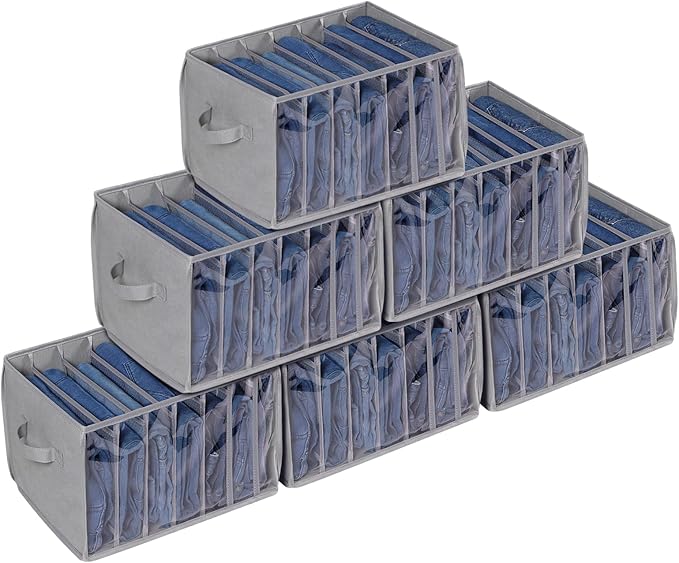 Zilink Upgraded Wardrobe Clothes Organizer with Support Board Clear Jeans Organizer for Closet with 7 Grids Divider Closet Drawer Organizer for Jean Pant Sweater Legging T-Shirt, 6 Pack, Grey