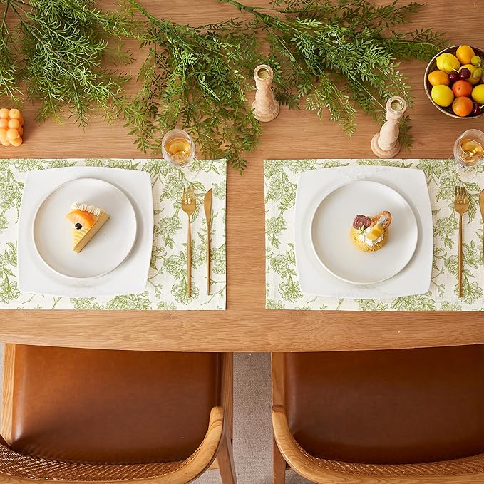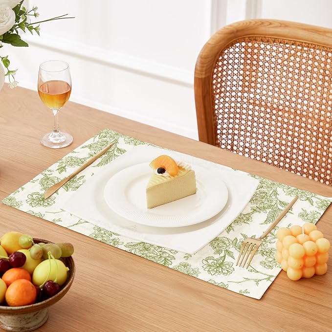 QIYI Boho Placemats Set of 6, 12x18 Inch Linen Fabric Floral Place Mats for Kitchen Dinning, Farmhouse Rustic Cloth Table Mats, Washable Placemat Party Table Décor, Green Botanical Art