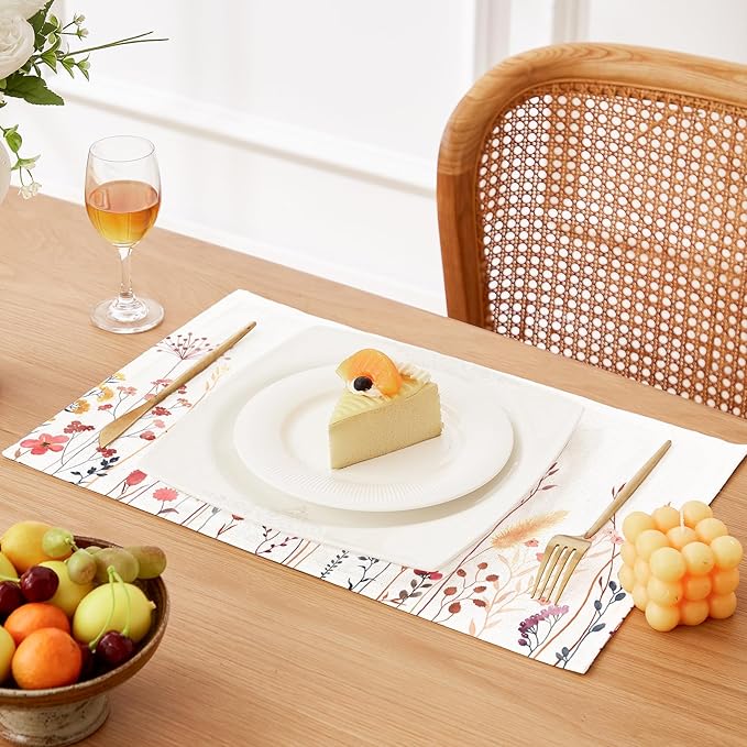 QIYI Boho Placemats Set of 6, 12x18 Inch Linen Fabric Floral Place Mats for Kitchen Dinning, Farmhouse Rustic Cloth Table Mats, Washable Placemat Party Table Décor, Autumn Wildflowers