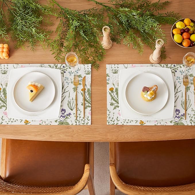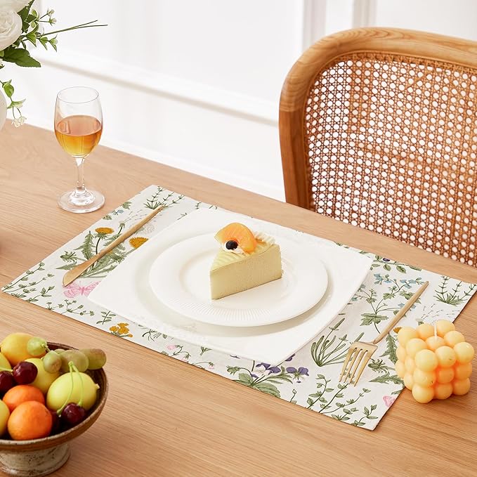 QIYI Boho Placemats Set of 4, 12x18 Inch Linen Fabric Floral Place Mats for Kitchen Dinning, Farmhouse Rustic Cloth Table Mats, Washable Placemat Botanical Party Table Décor, Wildflowers Herbs