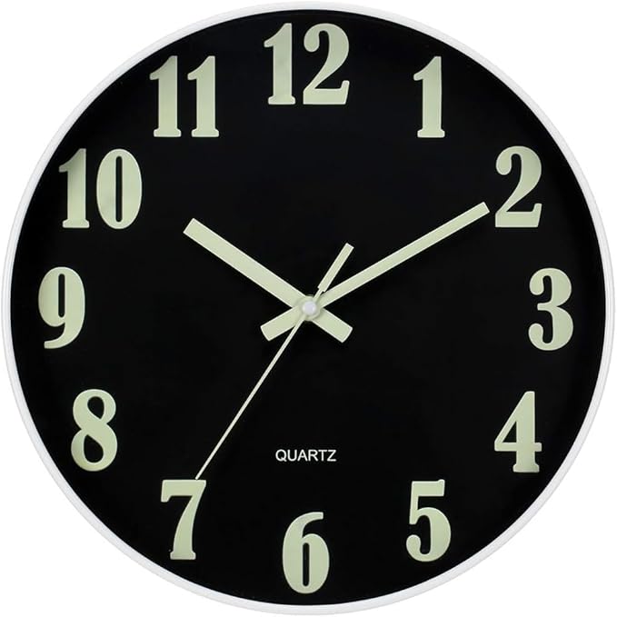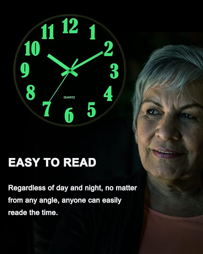 - ❶ 【Glow in The Dark】The numbers and hands which have night light function. It asks for absorbing enough light energy during the day. At night, it is released in a fluorescent manner, so you can see the light at night or in the dark.(The wall clock will glow in the dark for 3-6 hours or so, The glow time depends on the light absorbed in the day, The brightness of noctilucent gradually decreases, and it can't stay at its brightest all the time.)