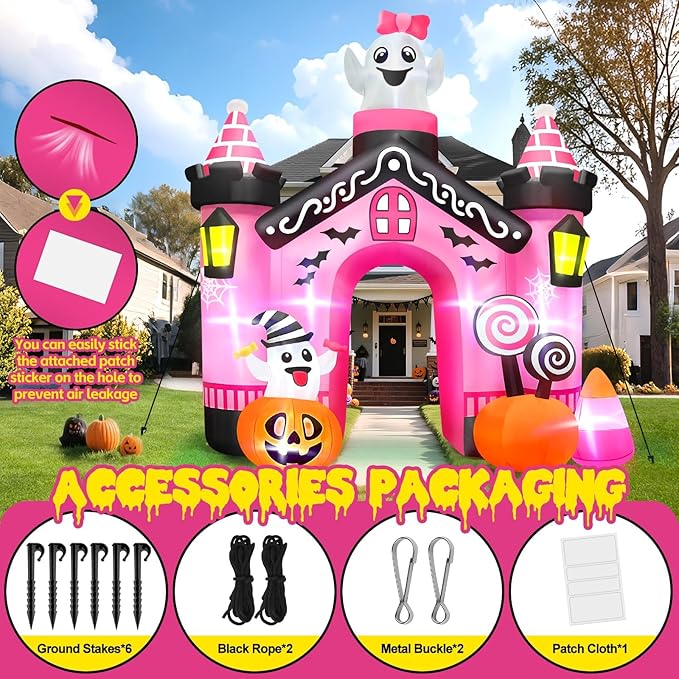 Kalolary 12 FT Halloween Inflatables Ghost Archway Outdoor Decorations, Pink Castle Arch Blow Up Yard Decorations Scary Inflatable with Build-in Lights for Yard Garden Lawn Indoor Outdoor Decor