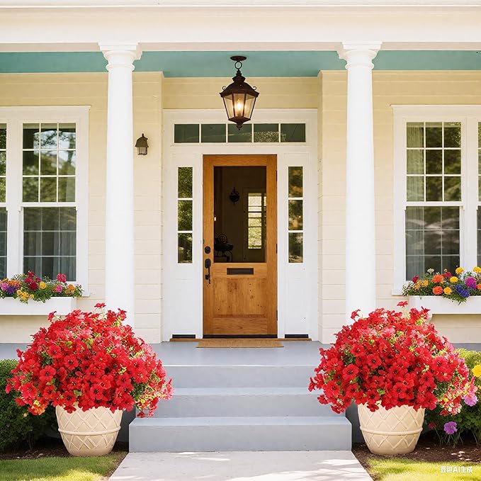 - 💐【Outdoor Artificial Plants】💐These aesthetically pleasing outdoor artificial plants are suitable for various areas of your home, including your porch, walkway, front yard, garden, living room, kitchen, bedroom, balcony, and more, adding a touch of natural beauty to your surroundings. Available in a variety of vibrant colors, these silk flowers require no watering and withstand harsh weather conditions without wilting.
