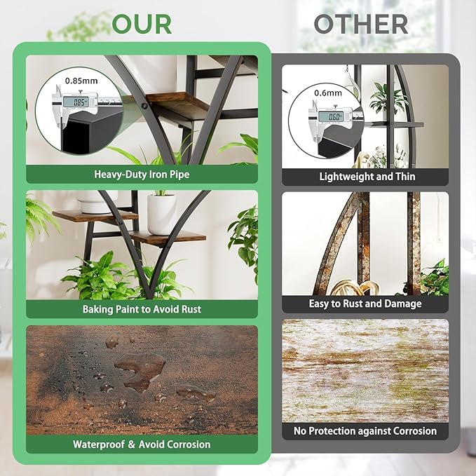 - High-Quality Material & Sturdiness: Crafted with a sturdy 0.8mm thick metal frame, high-quality 12mm particleboard shelves and adjustable foot pads, this plant holder ensures lasting durability and stability. The iron pipes feature a rust-resistant coating, while the shelves are treated with a water-resistant finish, allowing you to water your plants without worrying about damage.